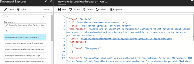 In order to populate the KB, I need content and I need it fast. I used Microsoft Azure blog and Azure Fridays RSS feeds to generate content. I built a tool that reads RSS feeds and creates JSON documents. The JSON documents are then uploaded to Cosmos DB using the Azure Cosmos DB Data Migration tool.