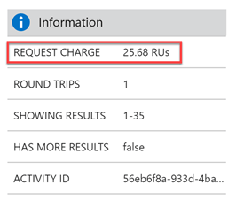 Another option is to use the Query Explorer. Query Explorer returns information on the Request Units (RUs) used by the query at the bottom of the left-hand pane.