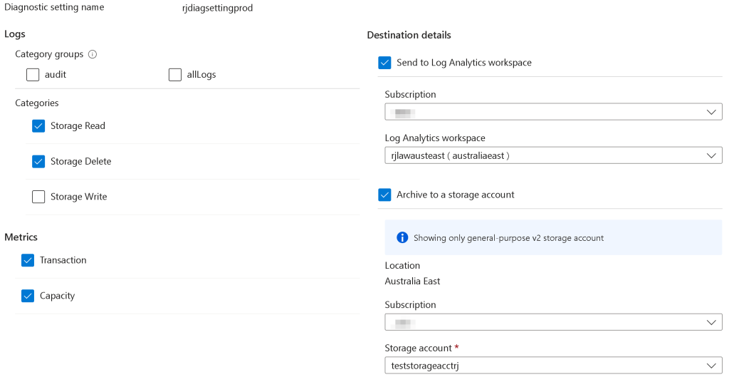 Once you execute the terraform init and terraform apply commands, the diagnostic settings will be configured for the storage account and key vault. Here are some screenshots showing the results of the module execution for Azure Storage.