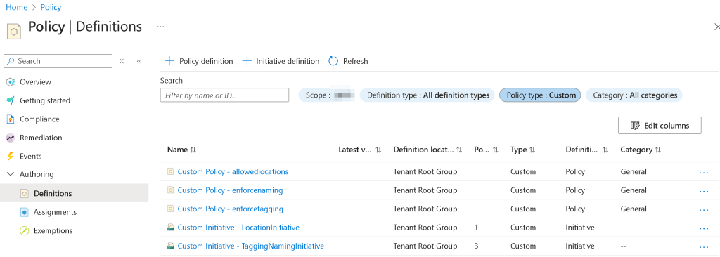 Deploying this code will deploy the custom Azure policies and initiatives listed in the policies.json file. Here is the screenshot of the custom policies and initiatives after terraform apply.